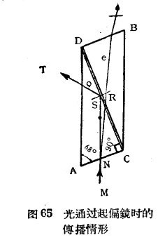 當常光經(jīng)NS投射于加拿大樹膠的S點上,其入射角大于臨界角,因此,向ST方向上發(fā)生全反射,不能透出鏡體而被授簡內(nèi)壁所吸收。非常光則不然,當它經(jīng)NR到達加拿大樹膠時,由于它的折射率比樹膠的小而與樹膠又很接近,因而產(chǎn)生折射而透效蹬體,其振動方向平行于菱形截面的短對角旋。